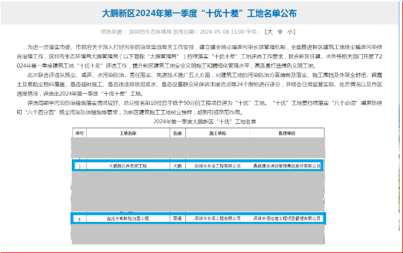 東深工程大鵬新區養老院項目再次斬獲2024年一季度質量安全綜合評估第一名